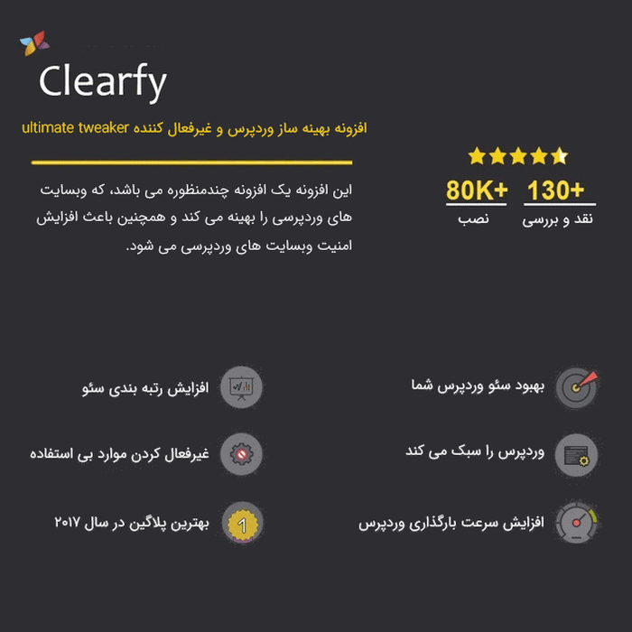 افزونه Clearfy Pro ، کلیرفای یک پلاگین برای سئو و بهینه سازی سایت، کاهش حجم تصاویر و افزایش سرعت و امنیت وردپرس می باشد. هزاران کاربر قبلاً سایتهای وردپرس خود را با افزونه Clearfy بهینه کرده اند. این ابزار چند منظوره دارای تنظیمات متنوعی است. این پلاگن عملکرد پلاگین هایی مانند Yoast SEO ، Autoptimize ، Wp super cache را تکمیل کرده و با بهینه سازی سئو و امنیت و افزایش سرعت و غیرفعال کردن توابع بی استفاده در زمان و وقت شما صرفه جویی می کند و امنیت وبسایت شما را بالا می برد. این افزونه ویژگی های حدود 50 پلاگین را در خود جای داده است.